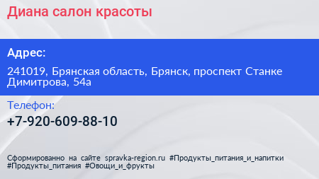 Диана, салон красоты по адресу 241019, Брянская область, Брянск, проспект Станке Димитрова, 54а в дальнейшем Организация, размещена в следующих категориях: