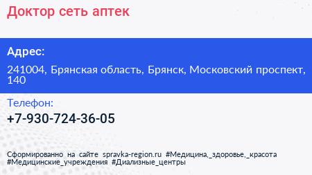 Доктор, сеть аптек по адресу 241004, Брянская область, Брянск, Московский проспект, 140 в дальнейшем Организация, размещена в следующих категориях: