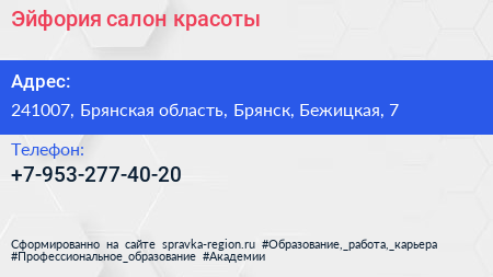 Эйфория, салон красоты по адресу 241007, Брянская область, Брянск, Бежицкая, 7 в дальнейшем Организация, размещена в следующих категориях: