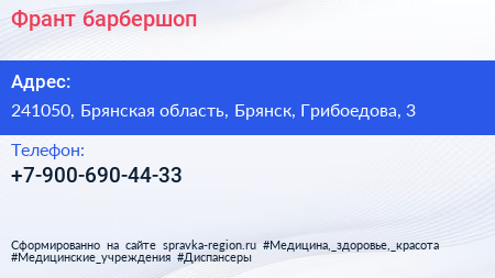Франт, барбершоп по адресу 241050, Брянская область, Брянск, Грибоедова, 3 в дальнейшем Организация, размещена в следующих категориях: