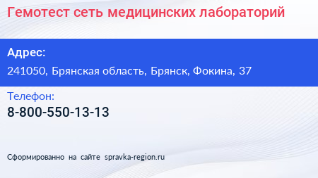 Гемотест, сеть медицинских лабораторий по адресу 241050, Брянская область, Брянск, Фокина, 37 в дальнейшем Организация, размещена в следующих категориях: