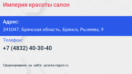 Империя красоты, салон по адресу 241047, Брянская область, Брянск, Рылеева, 9 в дальнейшем Организация, размещена в следующих категориях: