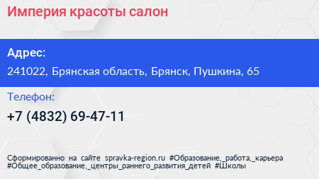 Империя красоты, салон по адресу 241022, Брянская область, Брянск, Пушкина, 65 в дальнейшем Организация, размещена в следующих категориях: