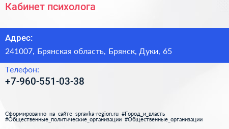 Кабинет психолога по адресу 241007, Брянская область, Брянск, Дуки, 65 в дальнейшем Организация, размещена в следующих категориях: