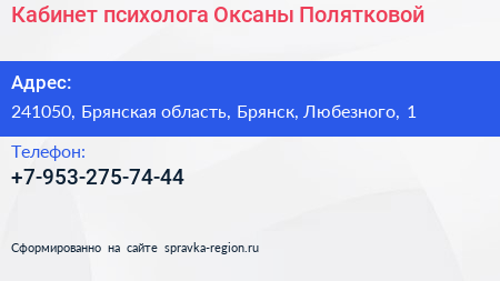 Кабинет психолога Оксаны Полятковой по адресу 241050, Брянская область, Брянск, Любезного, 1 в дальнейшем Организация, размещена в следующих категориях: