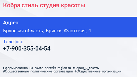 Кобра стиль, студия красоты по адресу Брянская область, Брянск, Флотская, 4 в дальнейшем Организация, размещена в следующих категориях: