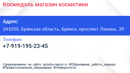 Космедэль, магазин косметики по адресу 241050, Брянская область, Брянск, проспект Ленина, 39 в дальнейшем Организация, размещена в следующих категориях: