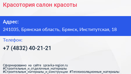 Красотория, салон красоты по адресу 241035, Брянская область, Брянск, Институтская, 18 в дальнейшем Организация, размещена в следующих категориях: