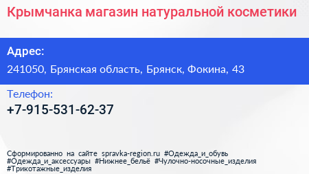 Крымчанка, магазин натуральной косметики по адресу 241050, Брянская область, Брянск, Фокина, 43 в дальнейшем Организация, размещена в следующих категориях: