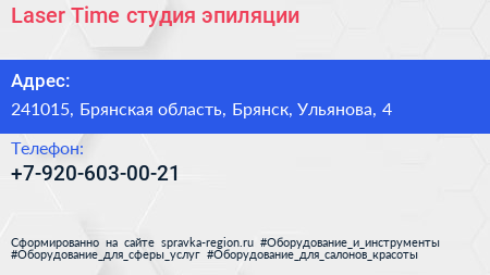 Laser Time, студия эпиляции по адресу 241015, Брянская область, Брянск, Ульянова, 4 в дальнейшем Организация, размещена в следующих категориях: