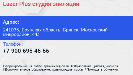 Lazer Plus, студия эпиляции по адресу 241035, Брянская область, Брянск, Московский микрорайон, 44а в дальнейшем Организация, размещена в следующих категориях: