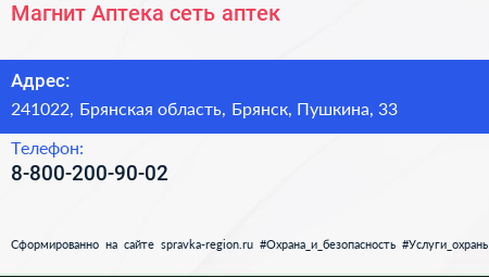 Магнит Аптека, сеть аптек по адресу 241022, Брянская область, Брянск, Пушкина, 33 в дальнейшем Организация, размещена в следующих категориях: