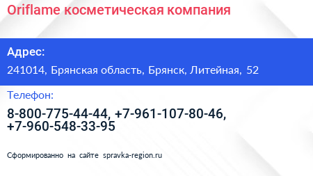 Oriflame, косметическая компания по адресу 241014, Брянская область, Брянск, Литейная, 52 в дальнейшем Организация, размещена в следующих категориях: