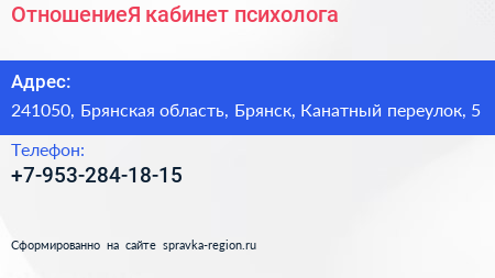 ОтношениеЯ, кабинет психолога по адресу 241050, Брянская область, Брянск, Канатный переулок, 5 в дальнейшем Организация, размещена в следующих категориях: