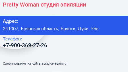 Pretty Woman, студия эпиляции по адресу 241007, Брянская область, Брянск, Дуки, 56в в дальнейшем Организация, размещена в следующих категориях: