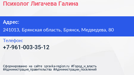 Психолог Лигачева Галина по адресу 241013, Брянская область, Брянск, Медведева, 80 в дальнейшем Организация, размещена в следующих категориях: