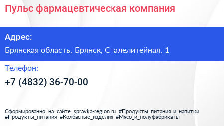Пульс, фармацевтическая компания по адресу Брянская область, Брянск, Сталелитейная, 1 в дальнейшем Организация, размещена в следующих категориях: