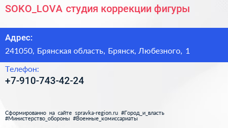 SOKO_LOVA, студия коррекции фигуры по адресу 241050, Брянская область, Брянск, Любезного, 1 в дальнейшем Организация, размещена в следующих категориях: