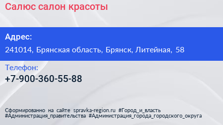 Салюс, салон красоты по адресу 241014, Брянская область, Брянск, Литейная, 58 в дальнейшем Организация, размещена в следующих категориях: