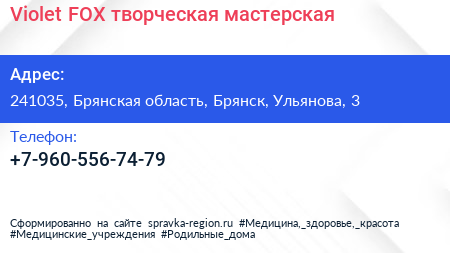 Violet FOX, творческая мастерская по адресу 241035, Брянская область, Брянск, Ульянова, 3 в дальнейшем Организация, размещена в следующих категориях: