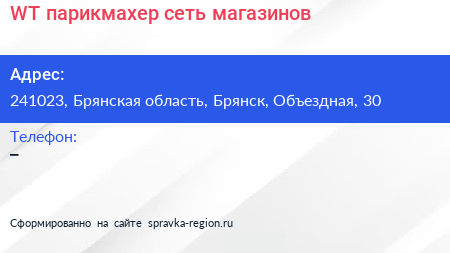WT-парикмахер, сеть магазинов по адресу 241023, Брянская область, Брянск, Объездная, 30 в дальнейшем Организация, размещена в следующих категориях: