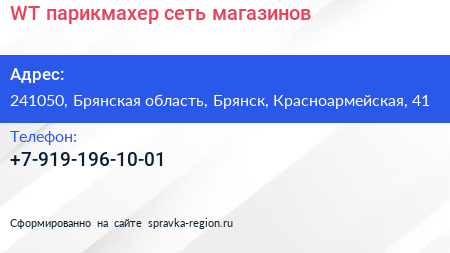 WT-парикмахер, сеть магазинов по адресу 241050, Брянская область, Брянск, Красноармейская, 41 в дальнейшем Организация, размещена в следующих категориях: