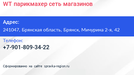 WT-парикмахер, сеть магазинов по адресу 241047, Брянская область, Брянск, Мичурина 2-я, 42 в дальнейшем Организация, размещена в следующих категориях: