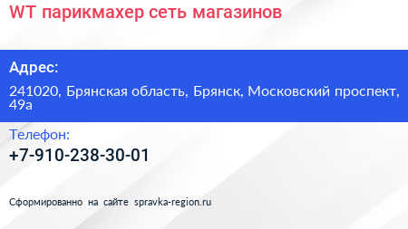 WT-парикмахер, сеть магазинов по адресу 241020, Брянская область, Брянск, Московский проспект, 49а в дальнейшем Организация, размещена в следующих категориях: