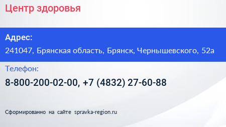 Центр здоровья по адресу 241047, Брянская область, Брянск, Чернышевского, 52а в дальнейшем Организация, размещена в следующих категориях: