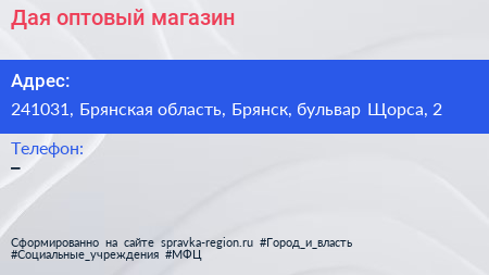Дая, оптовый магазин по адресу 241031, Брянская область, Брянск, бульвар Щорса, 2 в дальнейшем Организация, размещена в следующих категориях: