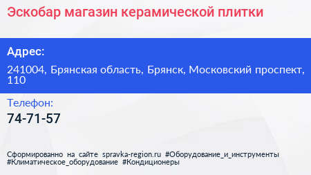 Эскобар, магазин керамической плитки по адресу 241004, Брянская область, Брянск, Московский проспект, 110 в дальнейшем Организация, размещена в следующих категориях: