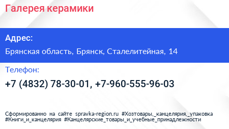 Галерея керамики по адресу Брянская область, Брянск, Сталелитейная, 14 в дальнейшем Организация, размещена в следующих категориях: