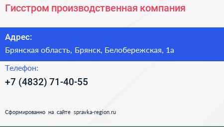 Гисстром, производственная компания по адресу Брянская область, Брянск, Белобережская, 1а в дальнейшем Организация, размещена в следующих категориях: