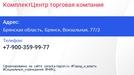 КомплектЦентр, торговая компания по адресу Брянская область, Брянск, Вокзальная, 77/2 в дальнейшем Организация, размещена в следующих категориях: