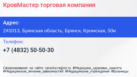 КровМастер, торговая компания по адресу 241013, Брянская область, Брянск, Кромская, 50и в дальнейшем Организация, размещена в следующих категориях: