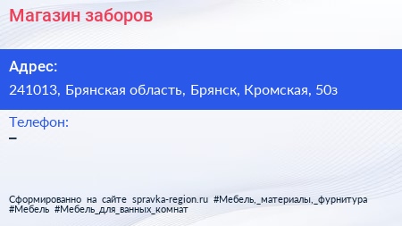 Магазин заборов по адресу 241013, Брянская область, Брянск, Кромская, 50з в дальнейшем Организация, размещена в следующих категориях: