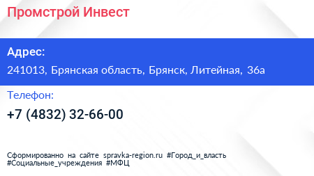Промстрой-Инвест по адресу 241013, Брянская область, Брянск, Литейная, 36а в дальнейшем Организация, размещена в следующих категориях: