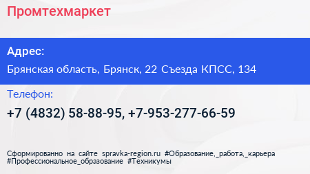 Промтехмаркет по адресу Брянская область, Брянск, 22 Съезда КПСС, 134 в дальнейшем Организация, размещена в следующих категориях: