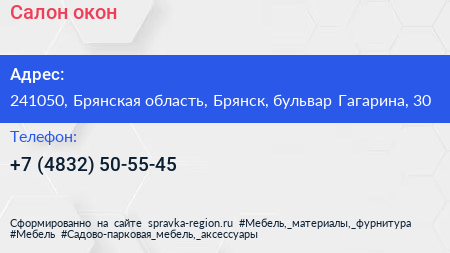 Салон окон по адресу 241050, Брянская область, Брянск, бульвар Гагарина, 30 в дальнейшем Организация, размещена в следующих категориях: