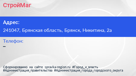 СтройМаг по адресу 241047, Брянская область, Брянск, Никитина, 2а в дальнейшем Организация, размещена в следующих категориях: