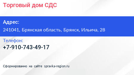 Торговый дом СДС по адресу 241041, Брянская область, Брянск, Ильича, 28 в дальнейшем Организация, размещена в следующих категориях: