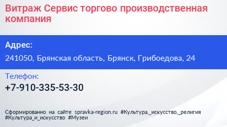 Витраж-Сервис, торгово-производственная компания по адресу 241050, Брянская область, Брянск, Грибоедова, 24 в дальнейшем Организация, размещена в следующих категориях: