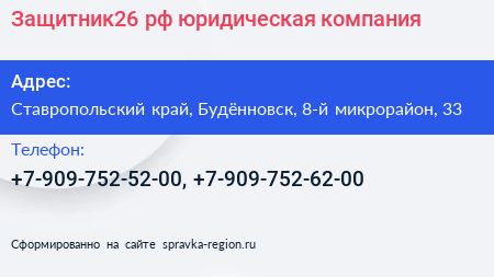 Защитник26.рф, юридическая компания по адресу Ставропольский край, Будённовск, 8-й микрорайон, 33 в дальнейшем Организация, размещена в следующих категориях: