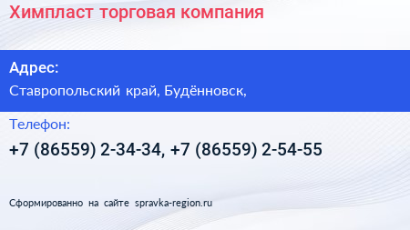 Химпласт, торговая компания по адресу Ставропольский край, Будённовск, в дальнейшем Организация, размещена в следующих категориях:
