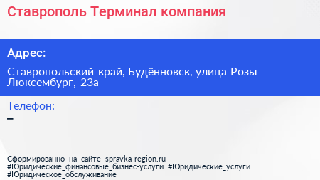 Ставрополь-Терминал, компания по адресу Ставропольский край, Будённовск, улица Розы Люксембург, 23а в дальнейшем Организация, размещена в следующих категориях: