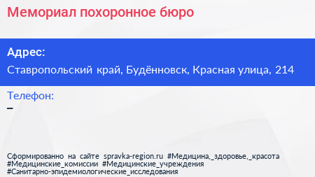 Мемориал, похоронное бюро по адресу Ставропольский край, Будённовск, Красная улица, 214 в дальнейшем Организация, размещена в следующих категориях: