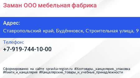 Заман, ООО, мебельная фабрика по адресу Ставропольский край, Будённовск, Строительная улица, 9 в дальнейшем Организация, размещена в следующих категориях: