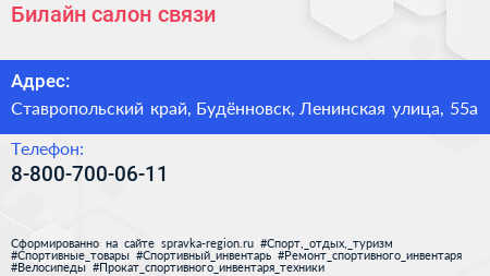 Билайн, салон связи по адресу Ставропольский край, Будённовск, Ленинская улица, 55а в дальнейшем Организация, размещена в следующих категориях:
