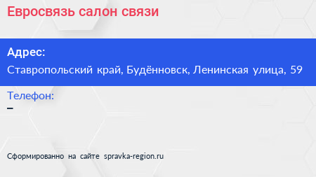 Евросвязь, салон связи по адресу Ставропольский край, Будённовск, Ленинская улица, 59 в дальнейшем Организация, размещена в следующих категориях:
