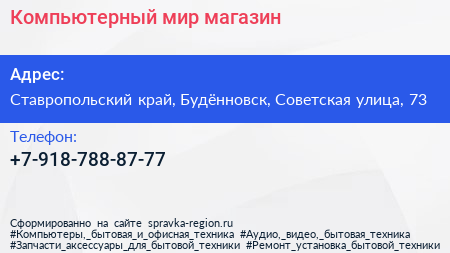 Компьютерный мир, магазин по адресу Ставропольский край, Будённовск, Советская улица, 73 в дальнейшем Организация, размещена в следующих категориях: